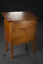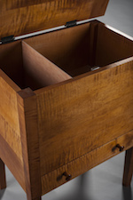 This piece captures the classic Southern appeal of an antique sugar chest except this one has been scaled down a bit to fit in a variety of places. It features mortise and tenon construction and a dovetailed drawer. The one pictured is made of solid tiger maple. Hinges are solid brass. While slightly smaller than a traditional sugar chest, our design still provides a nice amount of storage capacity.